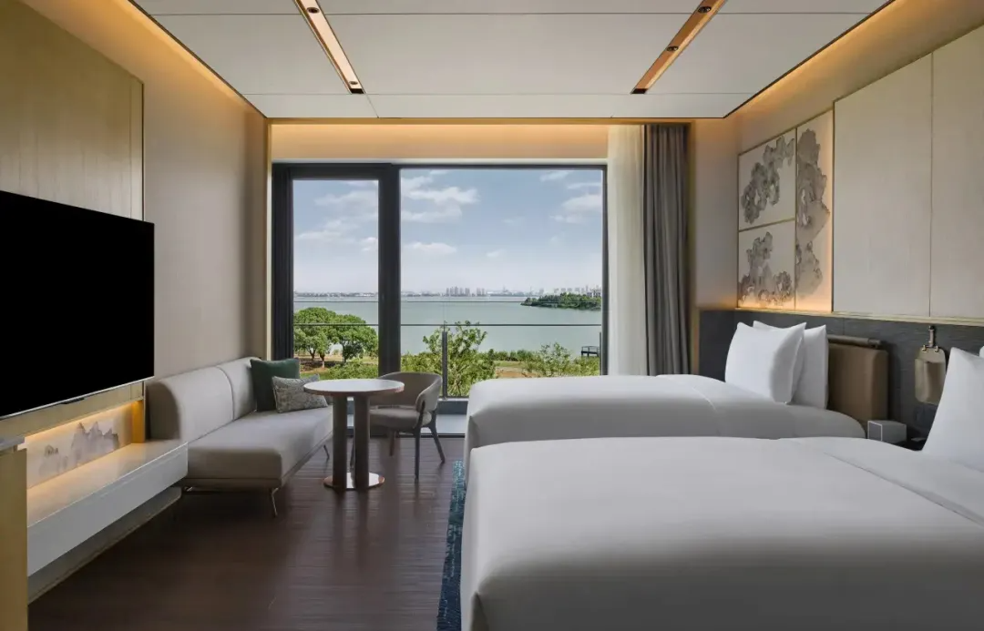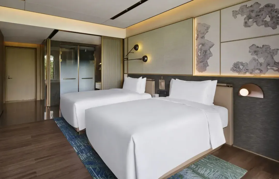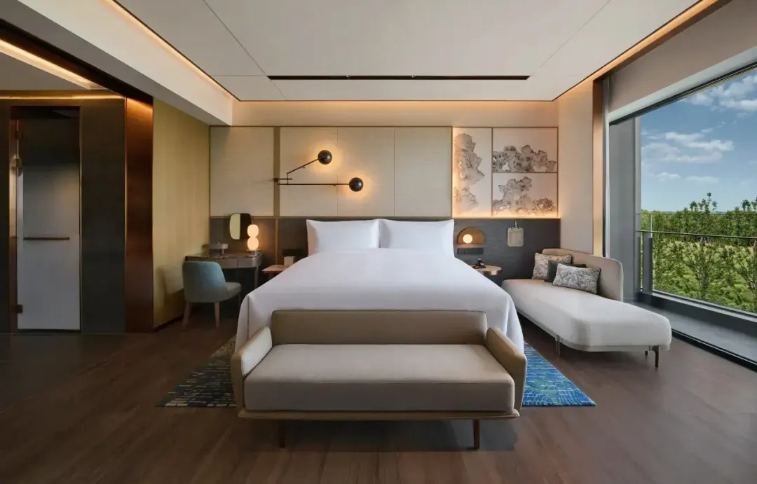 Beds & Headboards: Plush, tailored beds with headboards that blend light wood and textured fabrics—like a hug from a luxury blanket. The art behind the bed? A subtle nod to Suzhou’s famous stone landscapes.