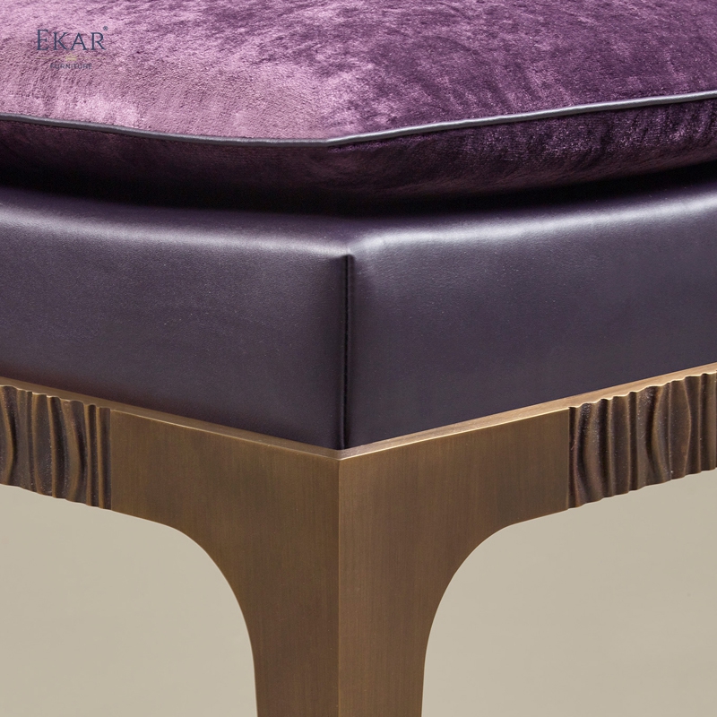 The stool's design is characterized by its harmonious blend of materials and finishes. The juxtaposition of the bronze base with the leather seat and fabric cushion creates a balanced aesthetic, reflecting EKAR's commitment to innovation and detail.