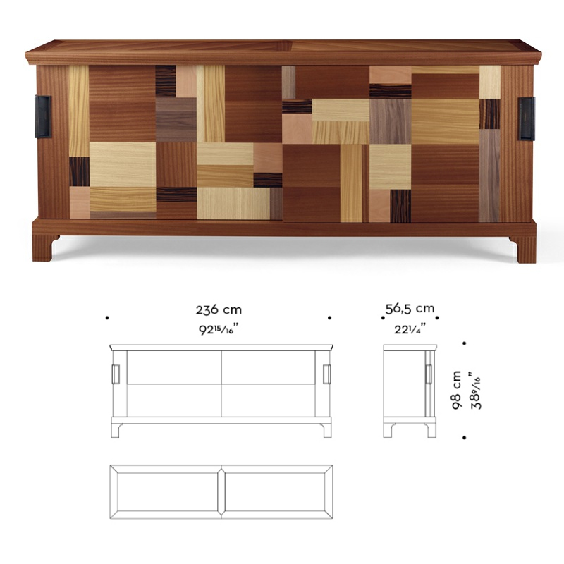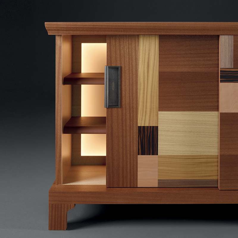 The chest boasts a wooden frame adorned with intricate patchwork inlays, utilizing a variety of wood types to achieve a harmonious blend of textures and tones. The sliding doors reveal shelves and drawers with leather fronts, while bronze handles add a touch of elegance. This combination of materials ensures both durability and aesthetic appeal.