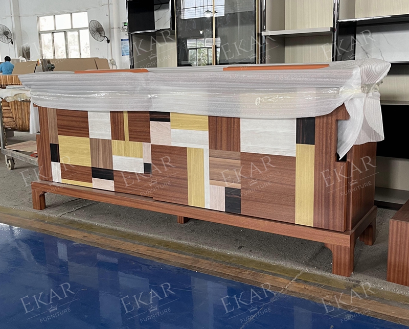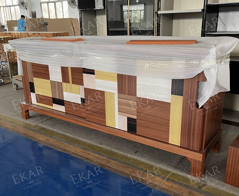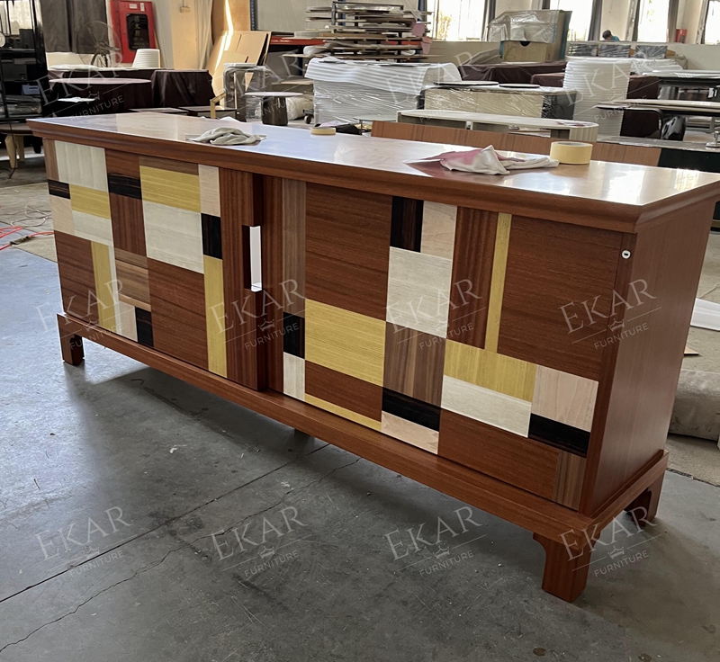 EKAR Furniture introduces a chest of drawers that seamlessly blends traditional craftsmanship with modern design. Inspired by the artistry of patchwork, this piece features a distinctive combination of various wood veneers, creating a unique mosaic pattern that exudes sophistication and charm.