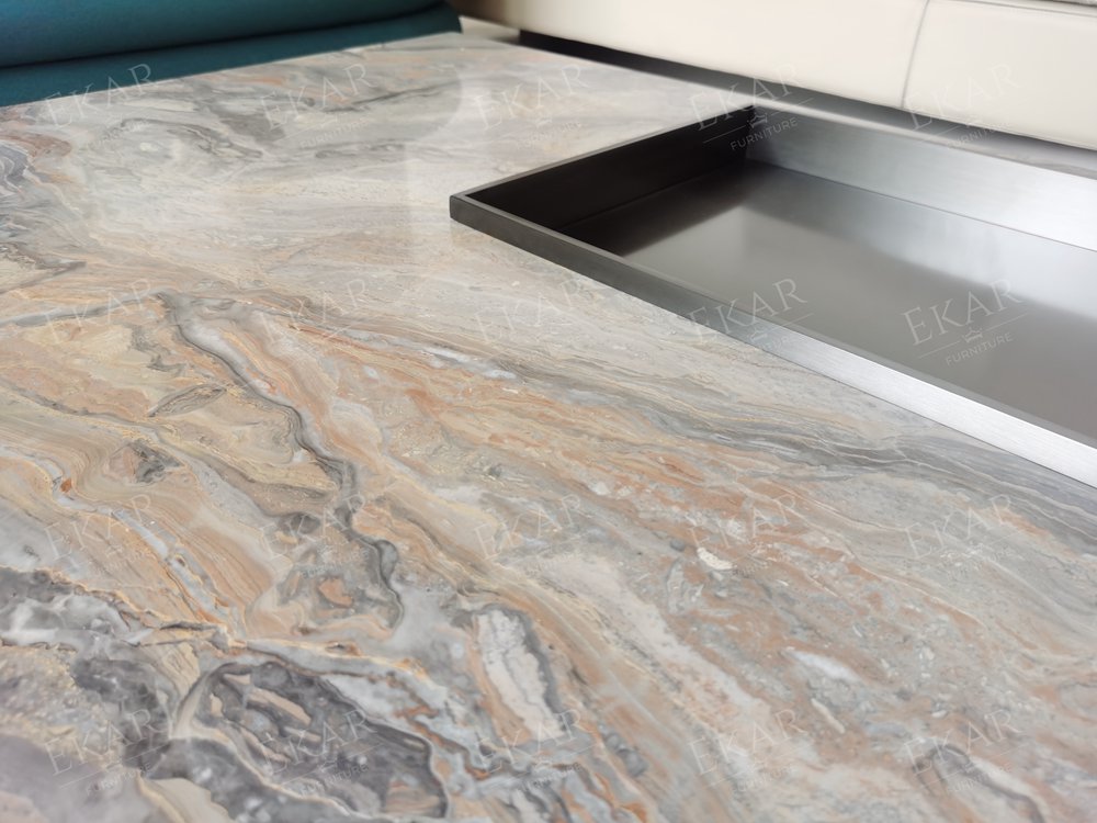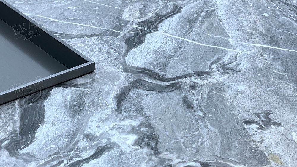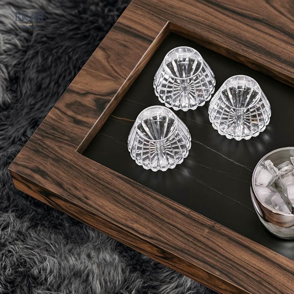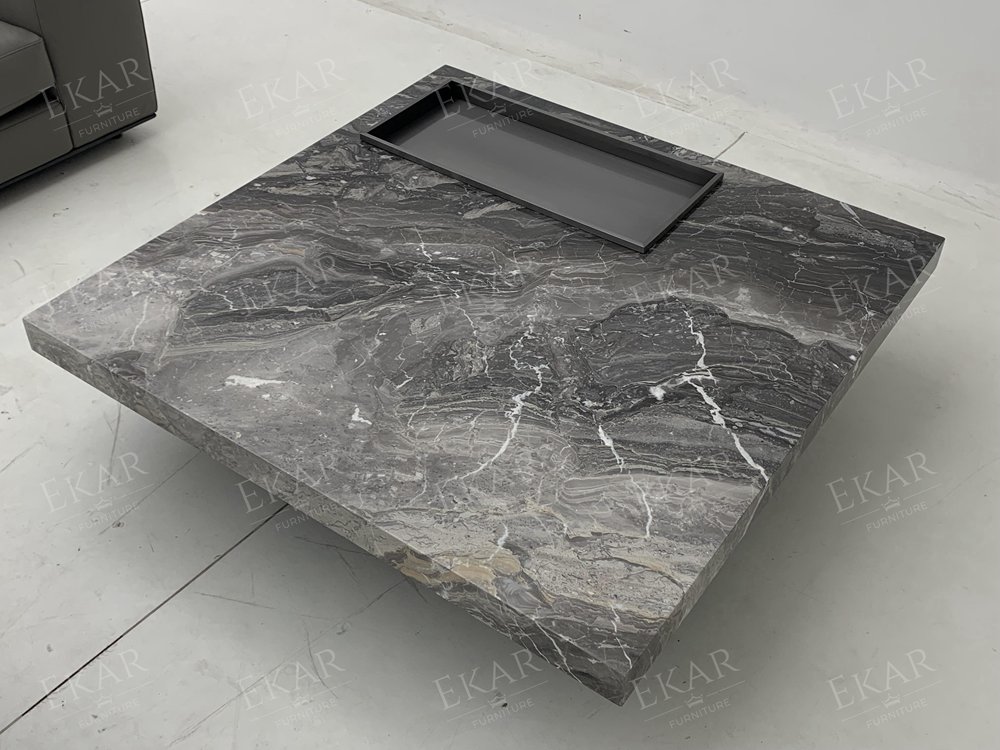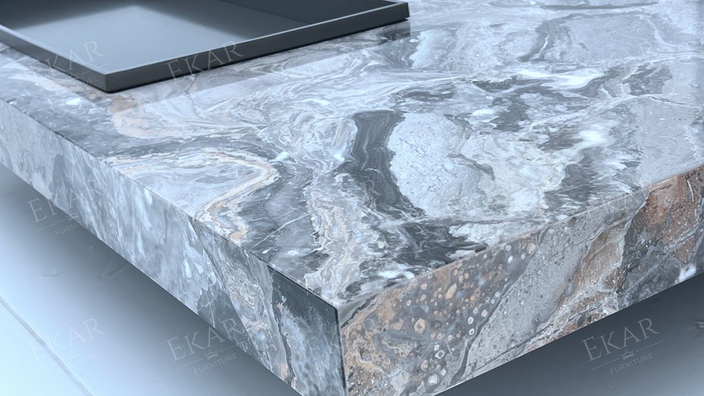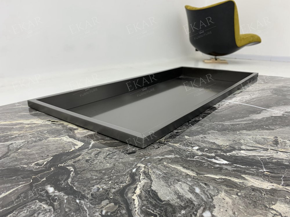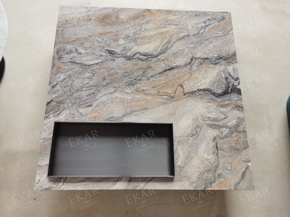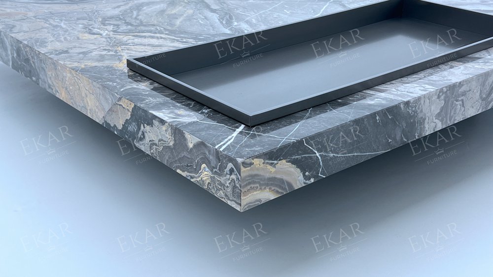 A: Standard options are solid wood veneer in walnut, ebony, and oak, natural marble, and sintered stone. Each top material is available with a contrasting tray insert. Custom top materials are available through EKAR FURNITURE's Foshan custom furniture factory subject to MOQ.