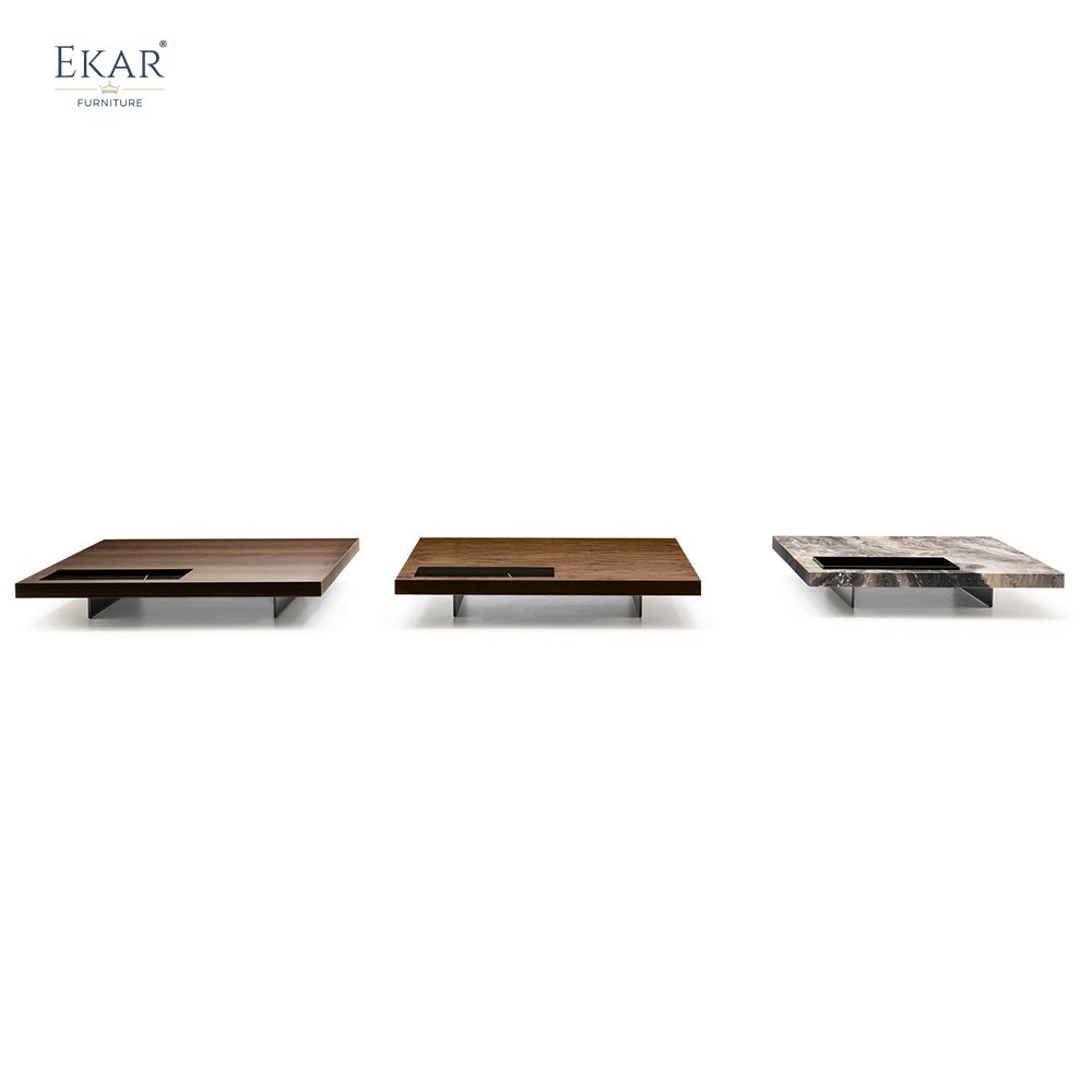 Design & Slab Top FormThe EKAR Slab Low-Profile Coffee Table is a modern living room table built around the generous material presence of a thick, flat slab top — a surface that communicates its material quality through depth and weight rather than decoration or surface treatment. The top sits low above the floor on a recessed slim metal rail base that is set inward from the top edge, creating the impression that the slab floats with minimal visible support beneath it. The thick edge profile is fully visible on all four sides, making the material depth — whether walnut veneer, ebony, marble, or sintered stone — the most prominent visual element of the table from any seated position in the living room. A recessed center tray section, inset slightly lower than the main top surface, runs along the center of the slab in a contrasting material — a stone insert on wood-top versions, or a wood insert on stone-top versions — adding a material dialogue within the top surface itself that rewards close inspection. EKAR FURNITURE developed the Slab as a living room coffee table for interiors where material quality and material weight are the primary design values — a table that anchors a sofa arrangement through physical and visual presence rather than through decorative complexity.