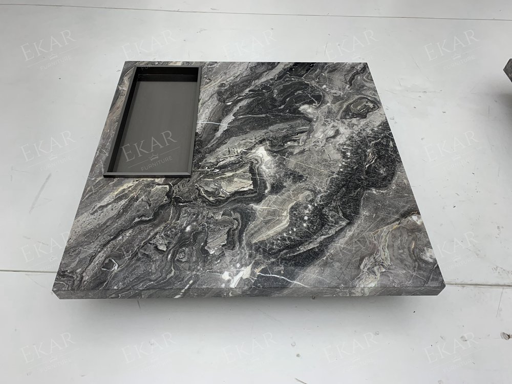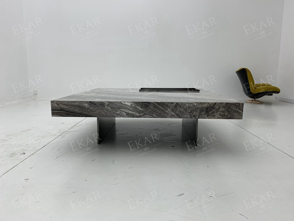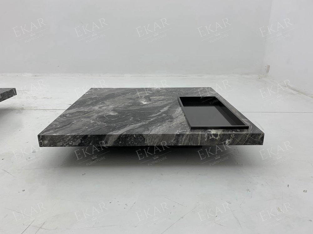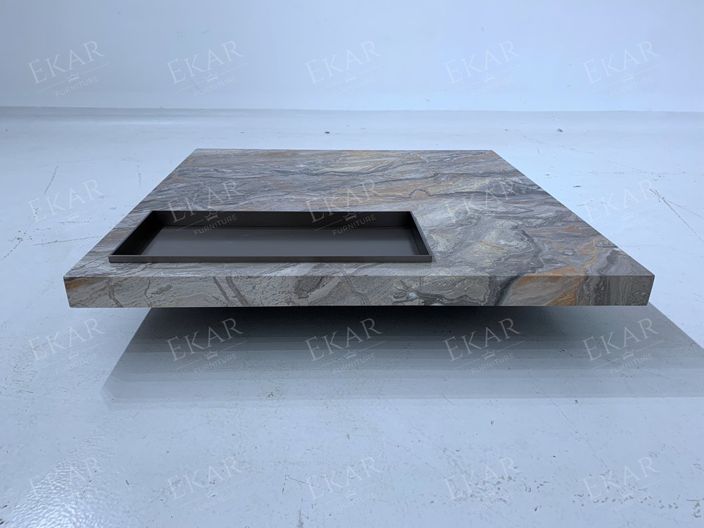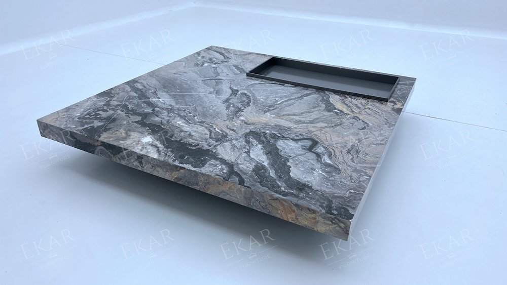 A: Yes. The Slab's thick material top, integrated tray detail, and floating chrome base create a sophisticated living room table suited to luxury hotel suite lounges, boutique private member club environments, and premium residential living rooms. EKAR FURNITURE supplies living room furniture to hospitality clients internationally with full custom specification support.