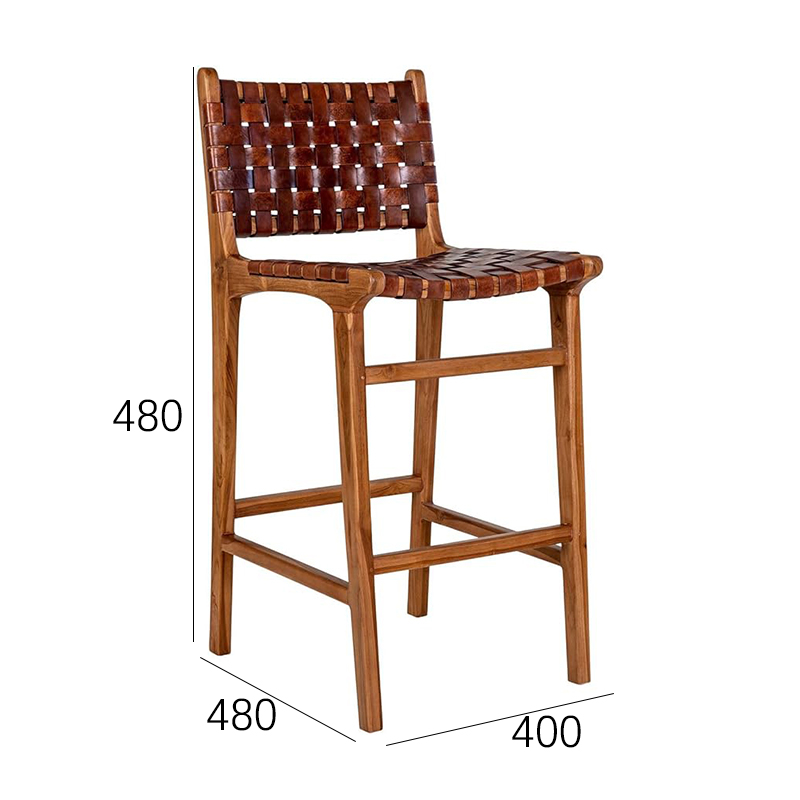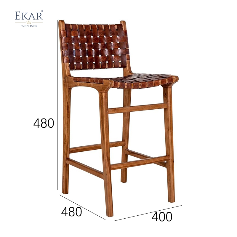 EKAR Sonoma Hand-Woven Leather Bar Stool with Solid Teak Frame