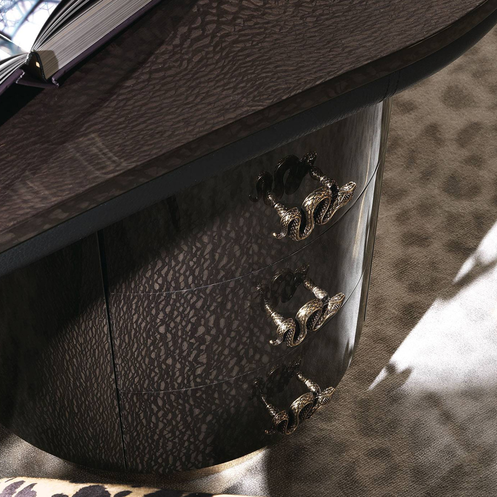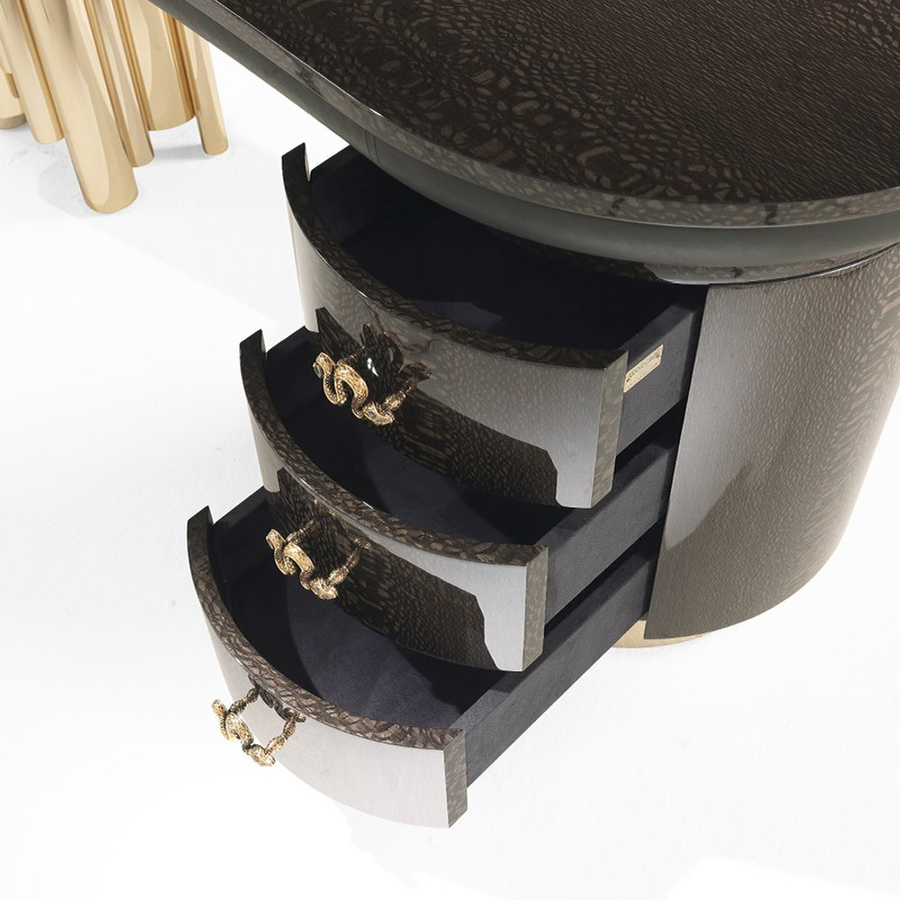 Beyond its aesthetic appeal, the desk offers practical features designed for contemporary needs. The drawers are lined with anthracite-colored microfiber and adorned with jewel handles in lost-wax cast brass, available in Gold or Platinum finishes. The top is made of multilayer wood, HDF, and MDF, veneered or lacquered to match the base, with the lower part covered in plain leather from the collection.