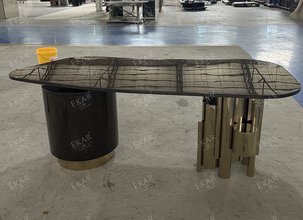 Introducing the EKAR New Design Executive Desk—a harmonious blend of premium wood and metal, exemplifying understated luxury. This desk is the perfect centerpiece for prestigious working spaces, combining functionality with sophisticated design.